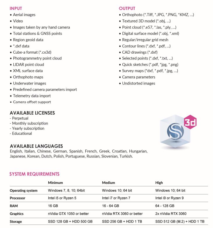 Cube-3d ist eine photogrammetrische Software für Kartierung und Luftbildverarbeitung, die sich an Landvermessungsspezialisten richtet. Es wird Bilddaten mit extremer Präzision in hochpräzise digitale Karten und 3D-Modelle umwandeln. Es importiert Cube-a-Vermessungen und ist vollständig kompatibel mit registrierten Stonex-Scans und mit allen 3D-Modellen von Drittanbietern. Es ist möglich, auf Punktwolken oder Netze zu zeichnen und Daten zusammenzuführen, die aus herkömmlichen Vermessungswerkzeugen importiert wurden, alles in einer einzigen Software. Anschließend können die Daten dank der verschiedenen CAD-Werkzeuge weiterverarbeitet und angereichert werden. Unter den vielen verfügbaren Funktionen sind die automatische Klassifizierung, Orthofoto, Querschnitte und Profillinien, Volumenberechnung und mehr am beliebtesten. Die Lizenzkonfiguration ist sehr flexibel, vom unbefristeten bis zum temporären Abonnement, sie passt sich den Bedürfnissen vieler Fachleute an.